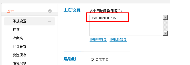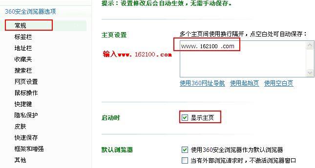 2)然后在打开的对话窗口中的主页设置的地址输入框中输入“http://hi.shukuonline.com/”设置修改后会自动生效,无需手动保存。如图所示: