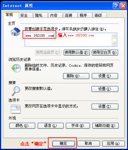 2)然后在打开的对话窗口中的主页栏的主页地址输入框中输入“http://hi.shukuonline.com/”,然后点击“确定”按扭即可,如图所示: